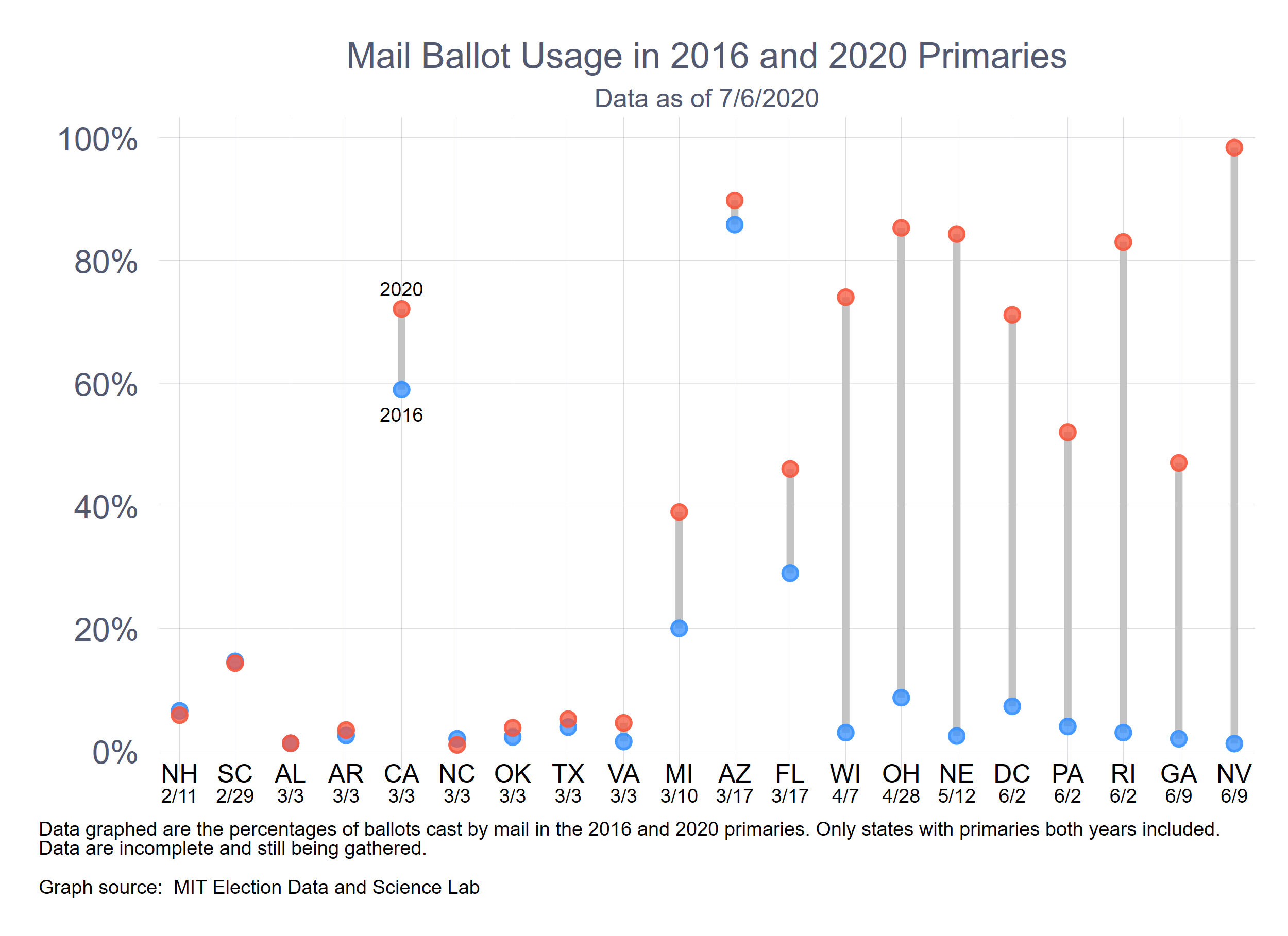 The MIT branch of the Stanford-MIT Healthy Elections Project has started a time series to follow the fraction of ballots cast by mail in the primaries. We will be updating on a regular basis and posting the graph to Twitter and here. Here is the most recent graph, as of July 6, 2020. Please let me know if you find any errors, have questions, or have leads on data. Below the graph are some notes on data sources.